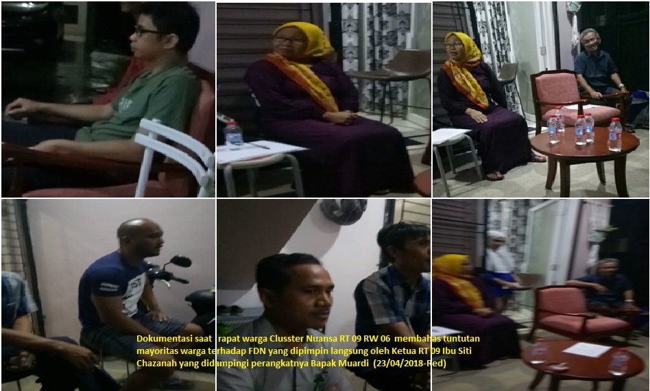 Dari hasil pemantauan LH pada saat musyawarah warga yang dihadiri oleh Ketua RT 09 Siti Chazanah dan Perangkatnya Muardi sempat terjadi ketegangan. Dimana mayoritas warga meminta dan menuntut FDN agar membongkar pagar bangunan rumahnya yang dianggap telah menyerobot jalan dan fasum sehingga merugikan seluruh warga cluster Nuansa. “ Saya mau memenuhi tuntutan Bapak/Ibu sekalian dengan syarat bahwa masing-masing rumah harus punya garasi mobil dan tidak ada mobil yang diparkir didepan rumah.” pungkas FDN menjawab tuntutan warga (23/04/2018-Red).