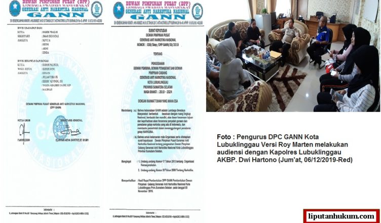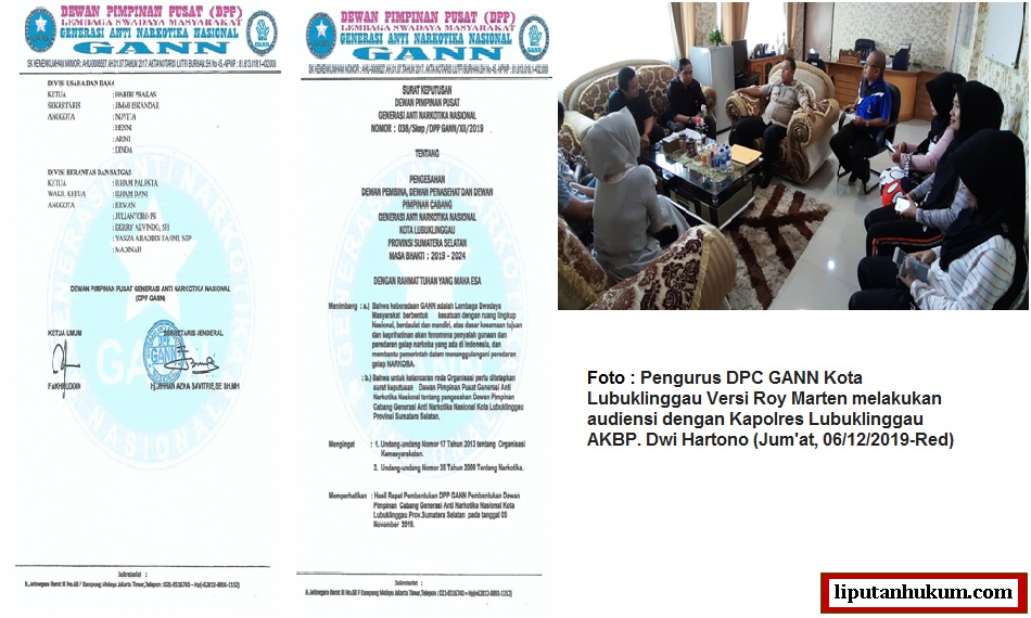 SUMSEL-LH: Jumat pukul 09.00 WIB Pengurus DPC GANN Kota Lubuklinggau Versi Roy Marten melakukan audiensi dengan Kapolres Lubuklinggau AKBP. Dwi Hartono, kedatangan DPC GANN versi Roy Marten bertujuan untuk bersilaturahmi dan membangun sinergi GANN dengan kepolisian kedepan. Pada kesempatan itu juga Roy Martin dkk, melaporkan kondisi kekinian DPC GANN Kota Lubuklinggau yang mana Roy ditunjuk langsung dan di SK kan langsung oleh DPP GANN sebagai Ketua DPC GANN.