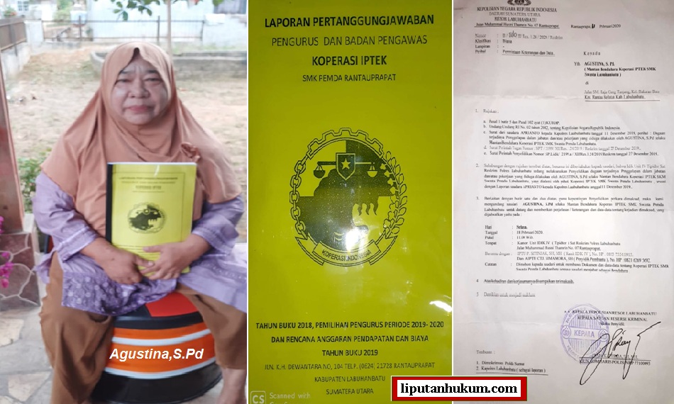 RANTAUPRAPAT-LH: Guru SMKS Pemda Labuhanbatu Agustina, S.Pd dilaporkan Mantan Kepala Sekolah Aprianto, S.Pd, MM kepada Kapolres Labuhanbatu Secara Tertulis dengan tuduhan dugaan Penggelapan Dalam Jabatan saat terlapor menjabat sebagai Bendahara Koperasi SMKS Pemda Labuhanbatu disatu sisi, sementara disisi lain Saat Pelapor juga masih menjabat sebagai Kepala Sekolah ditempat yang sama. Atas dasar Laporan Aprianto tersebut, Polres Labuhanbatu melayangkan Surat Panggilan kepada Agustina untuk dimintai Keterangan dan Data terkait laporan tersebut. Sesuai bunyi dari Surat Panggilan Polres Labuhanbatu yang ada ditangan terlapor, Agustina diminta hadir di Kantor Unit IDIK IV (Tipiter) Sat Reskrim Polres Labuhanbatu Pada Hari Selasa Tanggal 18 Pebruari 2020.