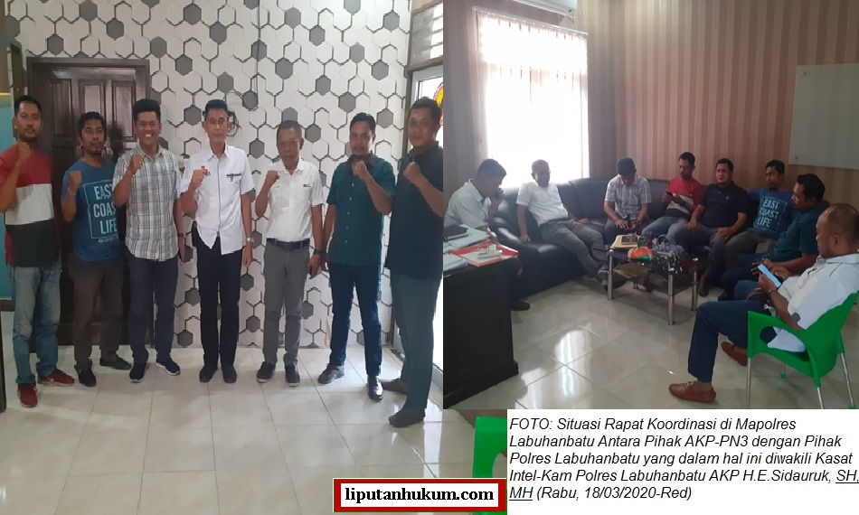 Ditempat yang sama, Kapolres Labuhanbatu AKBP Agus Darojat, SIK, SH, MH melalui Kasat Intel-Kam Polres Labuhanbatu AKP H.E. Sidauruk, SH, MH saat dikonfirmasi dan atau diklarifikasi oleh Wartawan LH membenarkan hal ini. ” Kita sudah bertemu, berkoordinasi dan berkomunikasi dengan pengurus AKP-PN3. kesepakatannya adalah mulai Hari Ini bila kepada Pencuri Produksi PTPN III kita terapkan UU No 39 Tahun 2014 Tentang Perkebunan, dan syarat-syaratnya sudah kita sampaikan agar disampaikan kepada Pimpinan PTPN III. Artinya, dengan adanya pertemuan hari ini semuanya sudah clear, dan aksi Pada Hari Kamis 19 Maret 2020 maupun berikutnya terkait dengan penerapan UU No 39 Tahun 2014 tentang Perkebunan tidak ada lagi, dan kita komitmen dengan kesepakatan bersama ini ” kata Kasat Intel Polres Labuhanbatu ini ((18/03/2020-Red).