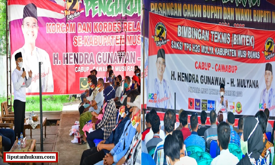MUSIRAWAS-LH: Jelang pencoblosan yang tinggal menghitung hari, untuk mempersiapkan dan mengawal suara di Tingkat TPS, Paslon Bupati-Wakil Bupati MusiRawas H Hendra Gunawan dan H. Mulyana (H2G-Mulya) membuka sekaligus memberikan pembekalan dan Bimbingan Teknis (Bimtek) kepada Para Saksi TPS Paslon Nomor Urut 2 H2G-Mulya (Selasa, 01/12/2020-Red).