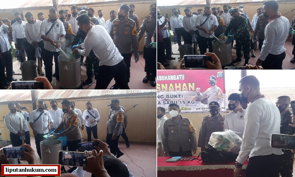 LABUHANBATU-LH: Satresnarkoba Polres Labuhanbatu menggelar Acara Pemusnahaan Barang Bukti Narkotika Golongan 1 Jenis Shabu Seberat 15 Kilogram dengan Nilai Rp 15 Miliar di Gedung Serba Guna Satmika Mapolres Labuhanbatu di Rantauprapat (Rabu, 02/12/2020-Red).