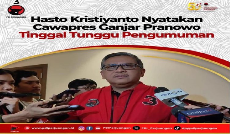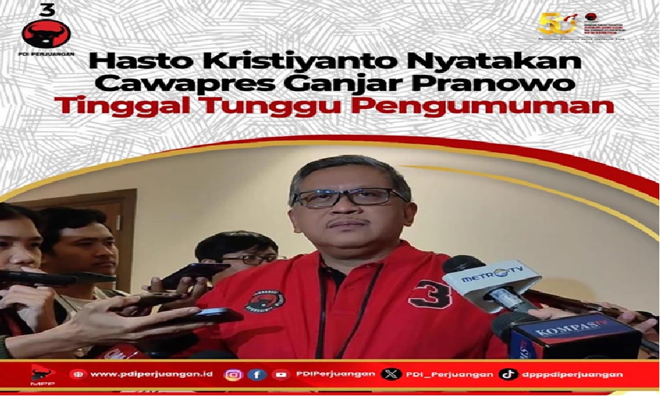 LIPUTANHUKUM.COM: Sosok Bakal Calon Wakil Presiden (cawapres) Ganjar Pranowo telah ditentukan berdasarkan masukan dari Para Ketum Partai Politik Koalisi termasuk masukan dari Presiden Jokowi. Hal ini disampaikan oleh Sekjen PDI Perjuangan Hasto Kristiyanto dalam cuitan yang disiarkan akun PDIP pada platform media sosial X.