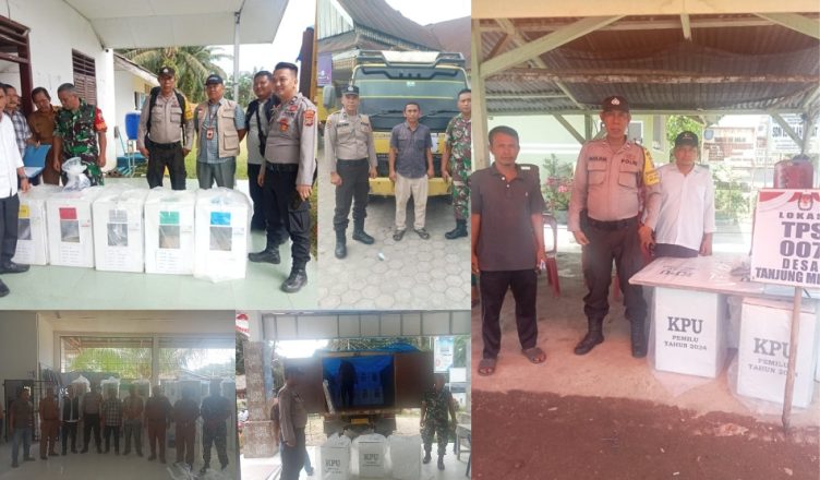 LABUHANBATU-LH: Personel Polres Labuhanbatu yang bertugas di wilayah Desa Janji Kec. Bilah Barat, Kab. Labuhanbatu, mengawal pergeseran material logistik suara Pemilu 2024 dari panitia pemilihan kecamatan (PPK) tingkat desa ke tempat panitia pemungutan suara (PPS), pada hari Selasa (13/02/2024).