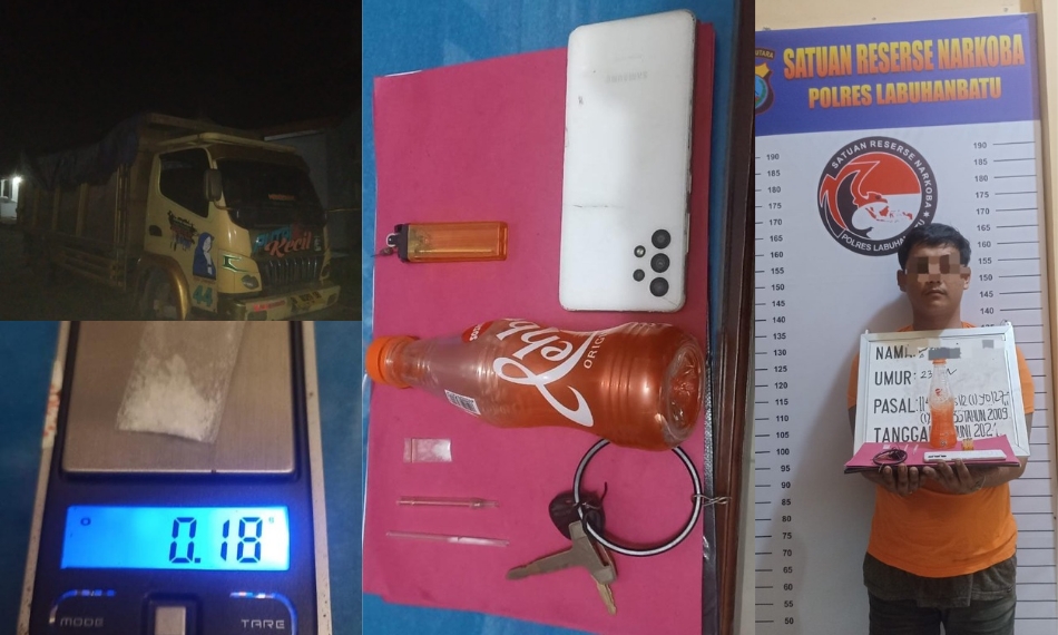 Barang bukti yang berhasil diamankan dalam penangkapan tersebut antara lain satu bungkus plastik klip transparan berisi narkotika jenis sabu seberat 0,18 gram bruto, satu buah kaca pirex bekas bakar yang diduga berisi narkotika jenis sabu seberat 1,21 gram bruto, satu buah mancis, satu buah alat hisap bong yang terbuat dari botol teh botol Sosro, satu buah handphone Android Samsung warna putih, dan satu unit mobil Mitsubishi dump truck dengan nomor polisi BK 8029 DB.