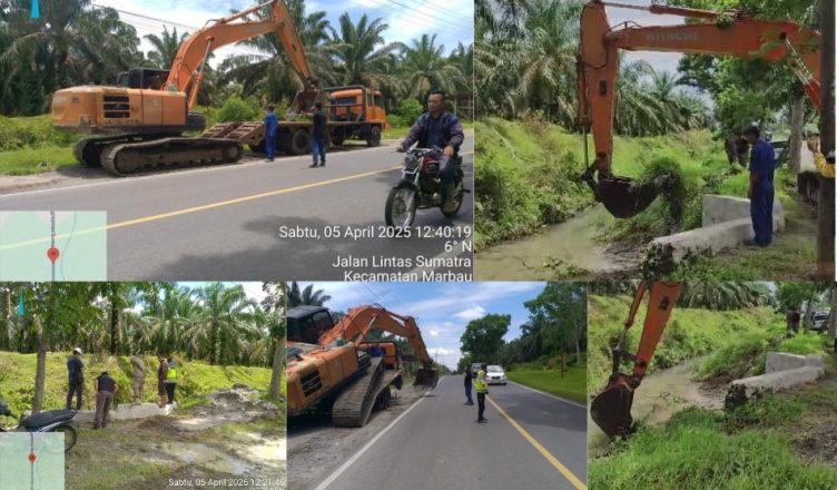 LABURA-LH: Gerak Cepat Polsek Na:IX-X Resor Labuhanbatu dengan memerintahkan PT Smart Pernantian untuk membersihkan Areal Parit dan Gorong-gorong yang menyebabkan banjir melimpah ke jalan raya Jalinsum sehingga terjadi macet panjang sepanjang 5 KM sehari yang lalu (04/04/2025).