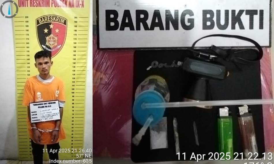 Mendapat informasi tersebut, Kapolsek Na: IX-X AKP Yustin SH MH langsung memerintahkan Kanit Reskrim IPDA DM Manik SH dan Team untuk langsung melakukan penyelidikan dan memburu informasi tersebut. Hasilnya, sekitar Pukul 19.00 WIB team berhasil mengamankan 1 (satu) orang laki-laki di dalam pondok tersebut yang sedang menggunakan/ mengisap Narkotika jenis Sabu-sabu. Selanjutnya team mengintrogasi pelaku dan pelaku mengakuinya.