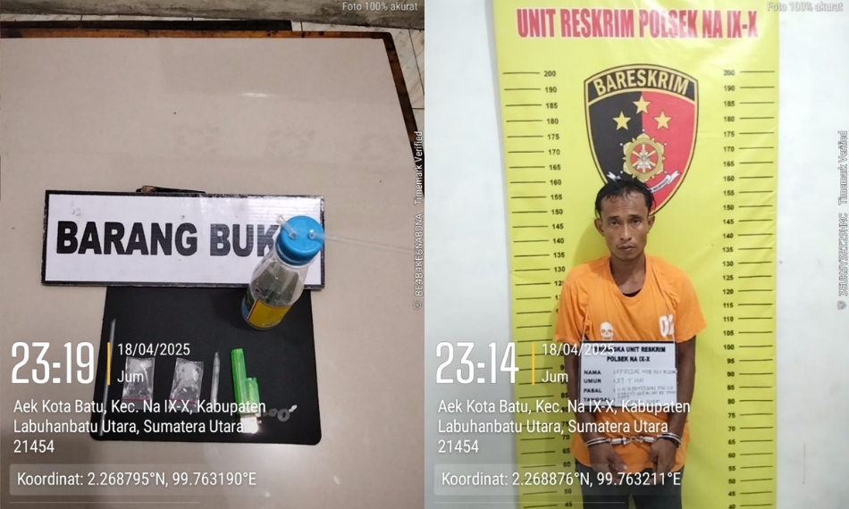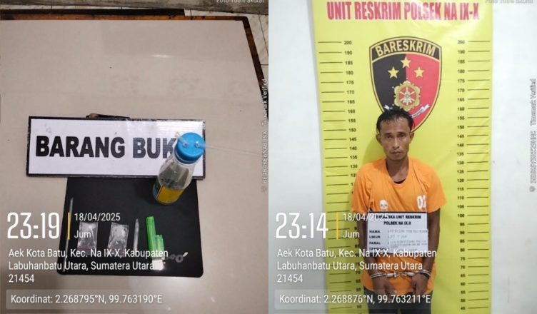 LABURA-LH: Team Opsnal Unit Reskrim Polsek Na:IX-X Resor Labuhanbatu berhasil membekuk seorang laki-laki bernama Safrizal alias Rizal (37 Tahun) di Pondok (Gubuk) tepatnya di Gang Nenas Desa Simpang Merbau Kecamatan Na: IX-X Kabupaten Labuhanbatu Utara (Labura) pada Jum’at (18/04/2025).