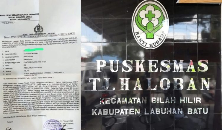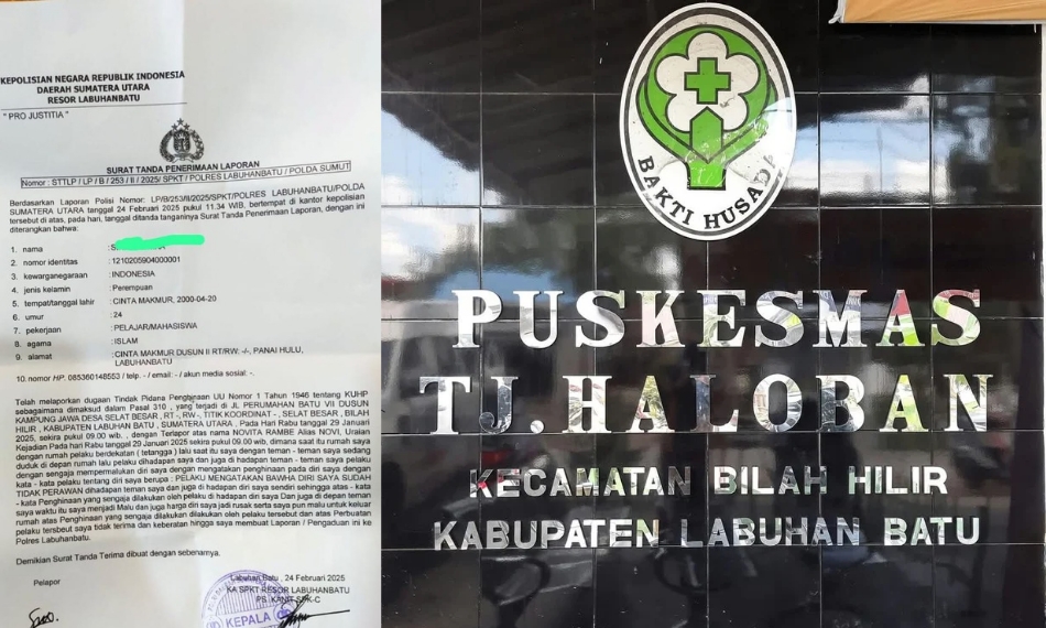 LABUHANBATU-LH: Warga Desa Cinta Makmur Kecamatan Panai Hulu berinisial SZ (24 Tahun) telah resmi melaporkan oknum ASN berinisial NR yang menjabat sebagai Staf Puskesmas Tanjung Haloban Kecamatan Bilah Hilir Kabupaten Labuhanbatu ke Polres Labuhanbatu dengan dugaan tindak pidana penghinaan pada bulan Februari 2025 yang lalu.