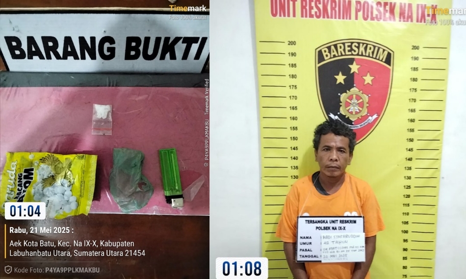 LABURA-LH: Team Unit Reskrim Polsek Na:IX-X Resor Labuhanbatu yang dipimpin oleh Kanit Reskrim Ipda DM Manik SH telah mengamankan satu orang laki-laki bernama Abdi Syarifuddin (45 Tahun) di Dusun III Desa Simpang Marbau Kecamatan Na: IX-X dan mengamankan Barang Bukti 1 ( satu) bungkus plastik klip diduga berisikan narkotika jenis sabu seberat 1,24 Gram/Brutto milik tersangka pada Selasa Malam (20/05/2025).