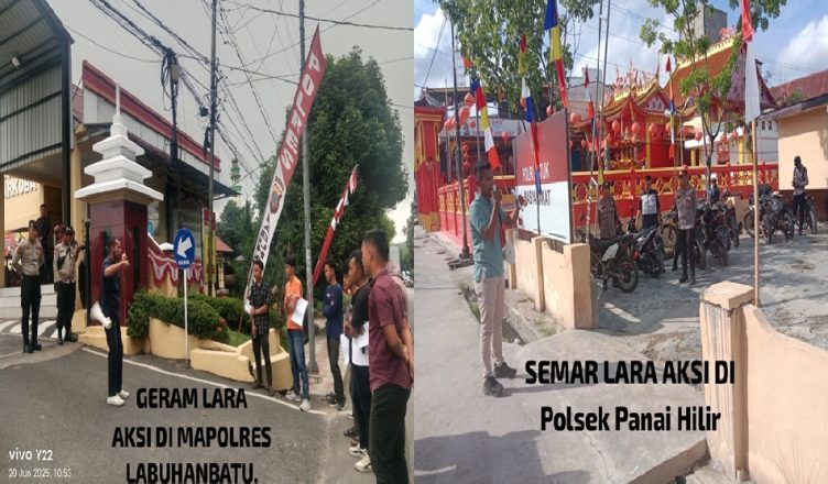 LABUHANBATU-LH: Puluhan mahasiswa yang tergabung dalam Gerakan Revolusi Aktivis Mahasiswa (GERAM) Labuhanbatu Raya dan Serikat Mahasiswa Revolusi (SEMAR) Labuhanbatu Raya gelar aksi serentak di dua titik, Mapolres Labuhanbatu dan Mapolsek Panai hilir (Jum’at , 20/06/2025).