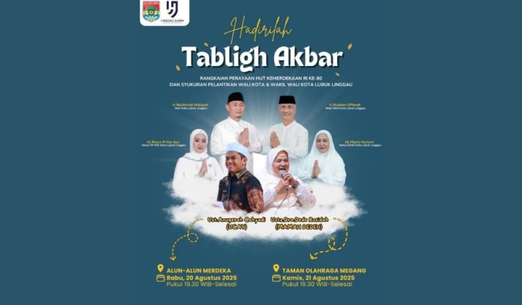 LUBUKLINGGAU-LH: Dalam rangka memperingati HUT ke-80 Kemerdekaan Republik Indonesia sekaligus syukuran atas pelantikan Walikota dan Wakil Walikota Lubuklinggau H Rachmat Hidayat dan H Rustam Effendi, Pemerintah Kota Lubuklinggau menggelar Tabligh Akbar selama dua hari berturut-turut.