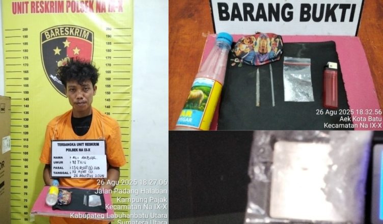 LABURA-LH: Team Unit Reskrim Polsek Na:IX-X Resor Labuhanbatu kembali berhasil mengamankan seorang laki-laki bernama Ali Akbar alias Ali (31 Tahun) disalah satu rumah kosong yang terletak di Dusun Pulo Godan Kelurahan Silumajang Kecamatan Na: IX-X Kabupaten Labuhanbatu Utara (Labura) pada Selasa (26/08/2025).