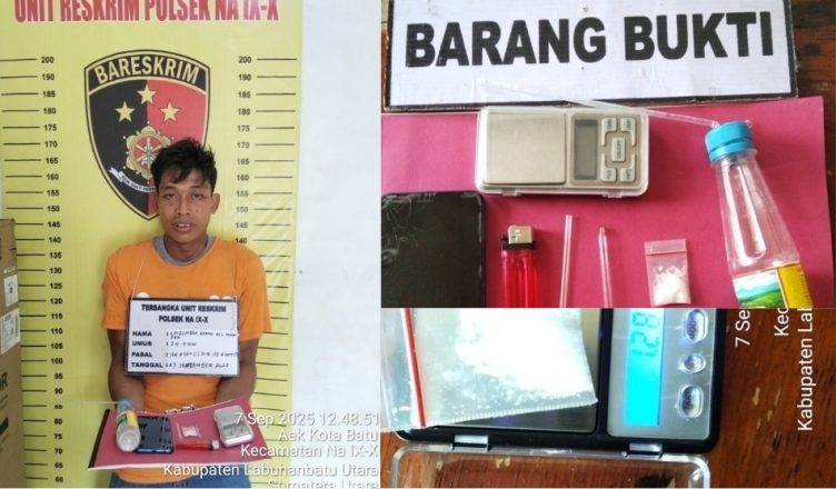 LABURA-LH: Unit Reskrim Polsek Na: IX-X mengamankan seorang laki-laki-laki bernama Edi Elpisah Als Tonggek (25 Tahun) dari dalam rumah kosong yang berada di Lingkungan V Purwosari Kelurahan Aek Kota Batu Kecamatan Na: IX-X Kabupaten Labuhanbatu Utara (Labura) terkait penyalahgunaan narkoba jenis sabu pada Minggu (07/09/2025) Pukul 11.00 WIB.