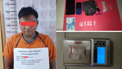 LABUHANBATU-LH: Dipimpin Kanit Reskrim Polsek Bilah Hilir Ipda P. Manalu, SH berhasil menangkap pelaku pengedar Narkotika jenis sabu berinisial AP Als Aji, laki-laki,