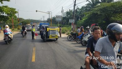 LABUHANBATU-LH: Personel Pos Yan 6 Gunting Saga Polres Labuhanbatu melaksanakan pengaturan arus lalu lintas di sekitar pos pelayanan 6 Gunting Saga, yang berlokasi