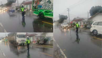 LABUHANBATU-LH: Personel Satuan Lalu Lintas Polres Labuhanbatu Aiptu Lumban Raja melakukan pengaturan arus lalu lintas dalam Ops Keselamatan Toba 2024. Kegiatan pengaturan lalu