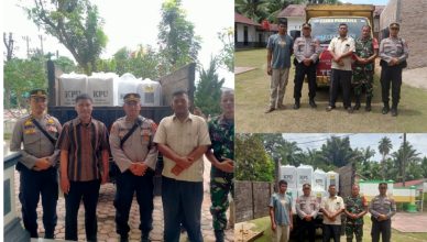LABUHANBATU-LH: Personel Polres Labuhanbatu yang bertugas di wilayah Desa Janji Kec. Bilah Barat, Kab. Labuhanbatu, mengawal pergeseran material logistik suara Pemilu 2024 dari
