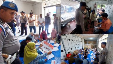 LABUHANBATU-LH: Personel Polres Labuhanbatu lakukan Pengamanan Sortir dan Pelipatan Surat Suara Pemilu 2024 oleh KPU Labuhanbatu Utara di Jln Kapten Zubit No 66.