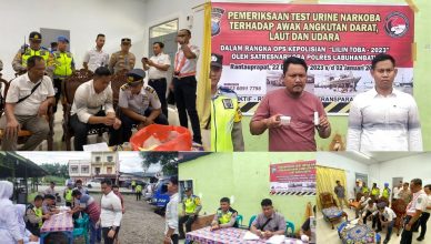 LABUHANBATU-LH: Polres Labuhanbatu menggelar pemeriksaan urine terhadap awak angkutan darat dalam rangka Operasi lilin Toba 2023 di Pos yan II Simpang Hocklie Jln