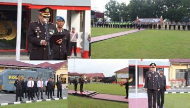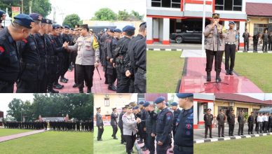 LABUHANBATU-LH: Kapolres Labuhanbatu, AKBP Dr. Bernhard L. Malau, S.I.K., M.H., memimpin apel pelepasan personel BKO Brimob di Lapangan Apel Mapolres Labuhanbatu, Jl. MH.