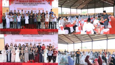 LABUHANBATU-LH: Polres Labuhanbatu mengadakan kegiatan makan bersama dalam rangka merayakan Idul Adha 1445 H. Acara ini berlangsung di Gedung Serbaguna Mapolres Labuhanbatu, Jalan